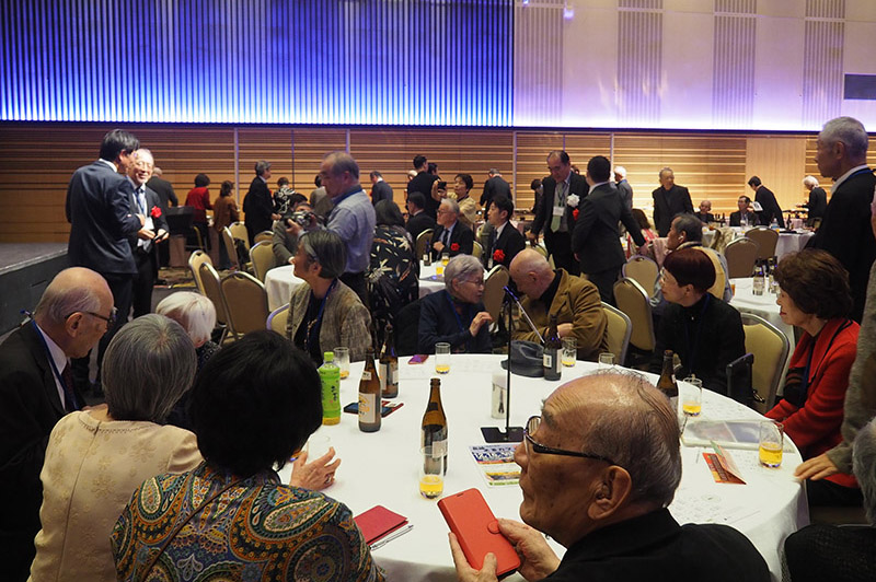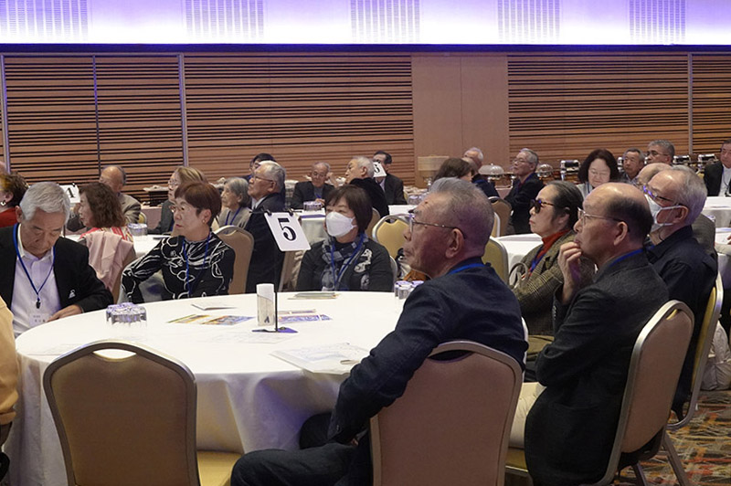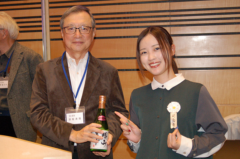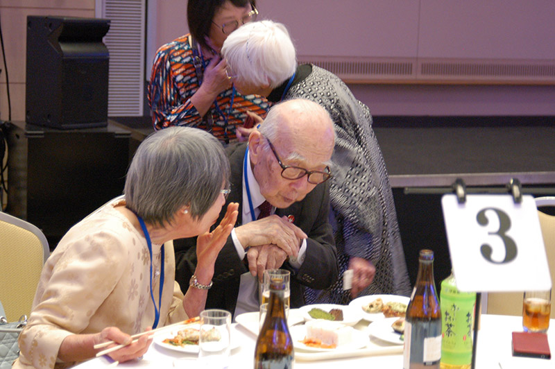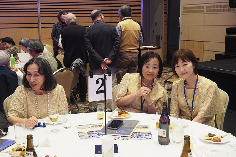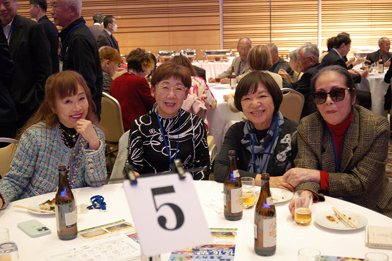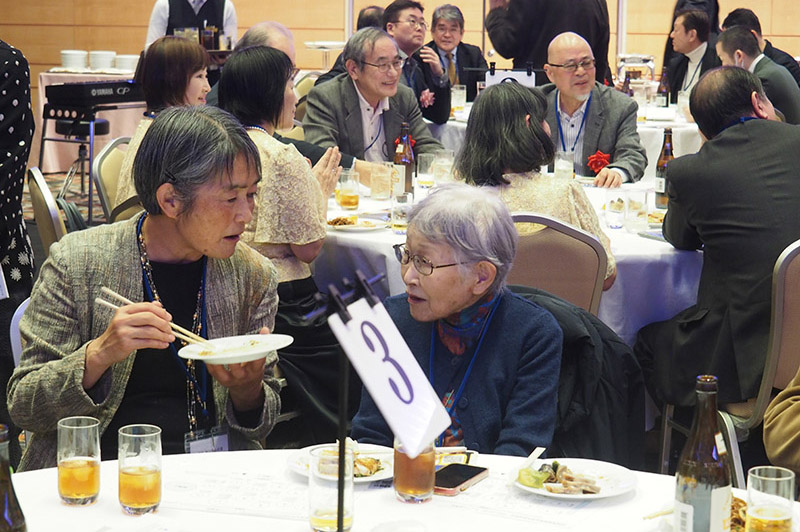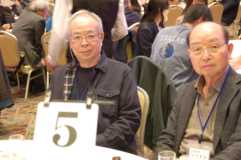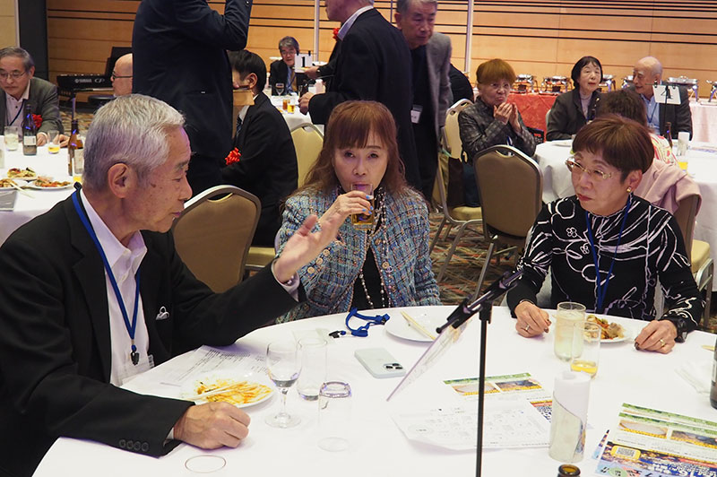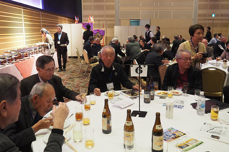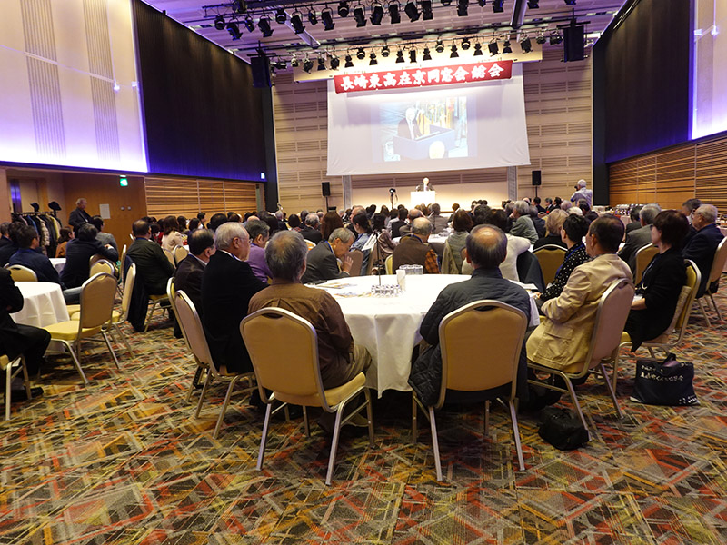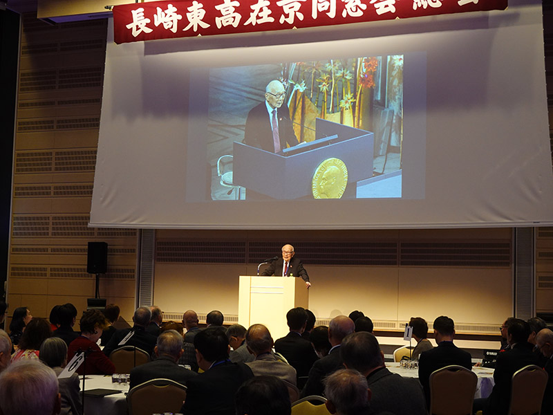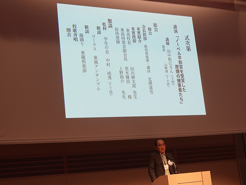 今回の目玉企画は、今年で2回目となる講演会です。2024年にノーベル平和賞を受賞された日本被団協 代表委員の田中煕巳さん(3回生)にご登場いただきました。会場のみなさんは、どんなお話をしてくださるのかと興味津々で田中さんの講演を熱心に聞きいっていました。講演会の後は、いつものように和やかで賑やかな歓談、そして、東風アンサンブルのコーラスや東龍倶楽部の龍踊りで盛大な総会となりました。今年も、長崎名産のご寄付、乾杯用東高校章入り特注グラスの提供を頂きました。厚く御礼を申し上げます。